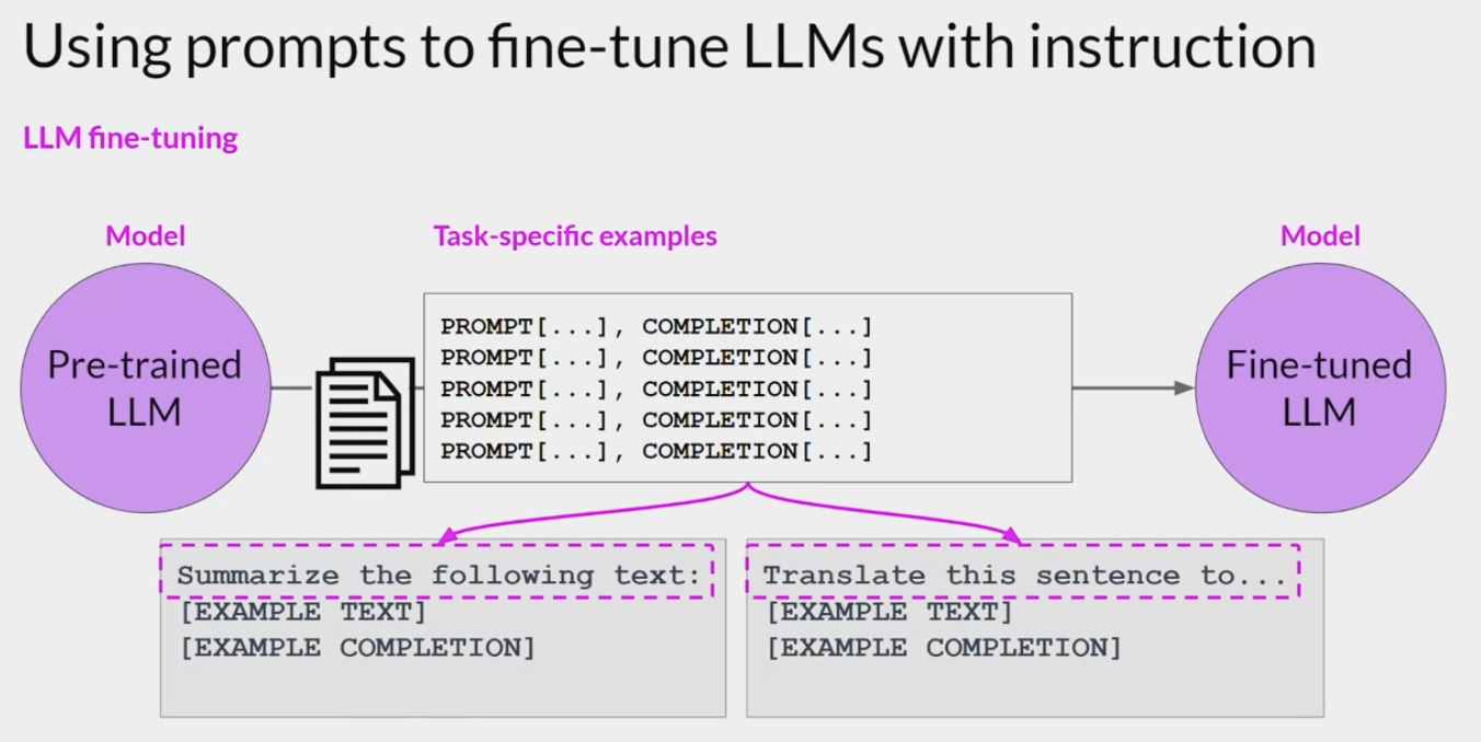 Remember that the output of an LLM is a probability distribution across tokens. So you can compare the distribution of the completion and that of the training label and use the standard cross entropy function to calculate loss between the two token distributions. And then use the calculated loss to update your model weights in standard back propagation. You’ll do this for many batches of prompt completion pairs and over several epochs, update the weights so that the model’s performance on the task improves. As in standard supervised learning, you can define separate evaluation steps to measure your LLM performance using the holdout validation data set. This will give you the validation accuracy, and after you’ve completed your fine tuning, you can perform a final performance evaluation using the holdout test data set. This will give you the test accuracy. The fine-tuning process results in a new version of the base model, often called an instruct model that is better at the tasks you are interested in. Fine-tuning with instruction prompts is the most common way to fine-tune LLMs these days. From this point on, when you hear or see the term fine-tuning, you can assume that it always means instruction fine tuning.