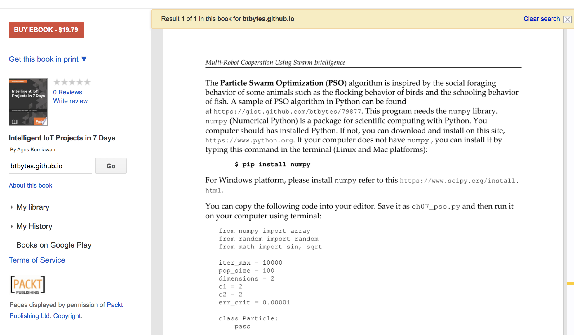 (A Particle Swarm Optimization) implementation in python in “Intelligent IoT Projects in 7 Days”. I remember writing this code for Dr Eberhart’s “Computation Intelligence” class at IUPUI.